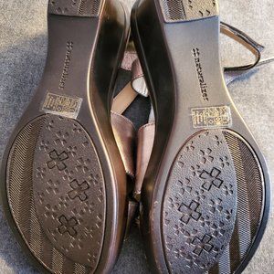 Not too high platform bronze sandals, not worn, adjustable with Velcro strap at the back.