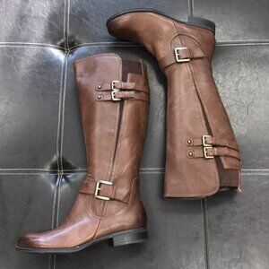 Elegant chestnut boots with stylish buckles. Perfect for any occasion. Comfortable and chic. Beautiful boots just received them and unfortunately i thought I ordered the wide calf. Too small for me.Brand New