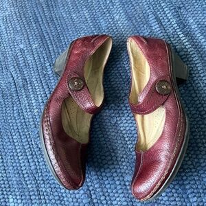 Cute and comfortable Mary Janes. Leather upper. Low rubber heel, comfort insoles, elastic attachment for strap. Size 8. Wide width. In very good used condition. There’s a bit of scuffing and wear of the dye around the ankles…wouldn’t be noticeable with the right colour polish.