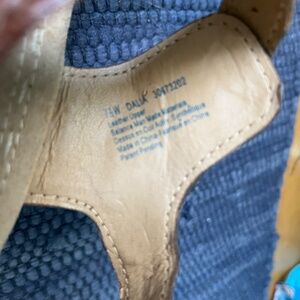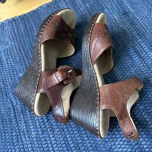 Fun boho wedge sandal that’s comfortable. Brown sandal, leather upper, embroidered detail, ankle strap, wrapped buckle, faux wood detail on 3” wedge. In very good used condition.