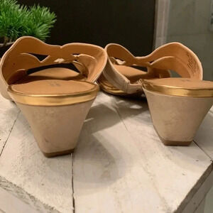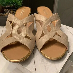 Gorgeous goldtone sparkle slip on sandals with gold trimming. Gently used and in excellent condition. Size 10.