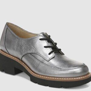 Sharp and comfortable! These pewter/metalic leatherr oxfords/loafers from Naturalizer have a leather upper and a rubber sole with 2 in heel and slight platform.