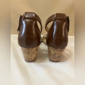 Women's Naturalizer cork wedge sandals. Size 5M. Ankle strap Velcro closure. Black and white fabric accents. Very comfortable!
