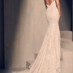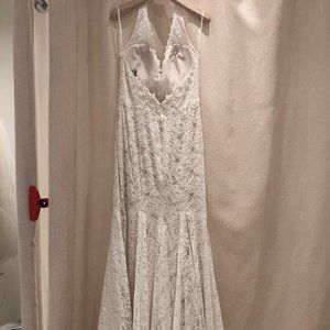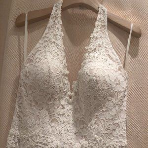 Natural/latte liner, halter, deep V, fit and flare, pearls