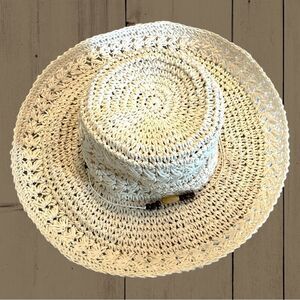 Adorable summer floppy beach hat. Natural straw, off white colour, with wooden beads around the brim. Flip up the front of the hat if you feel the need to see anything lol. Its definitely a beach hat, cute and keeps the sun off your face. Excellent condition.