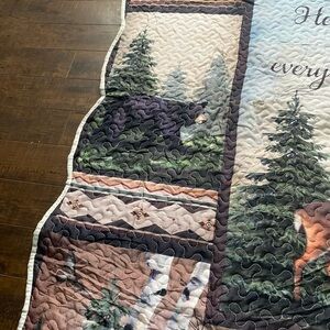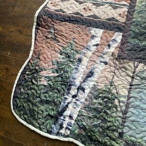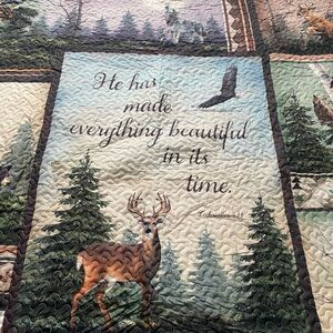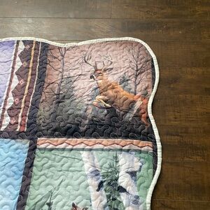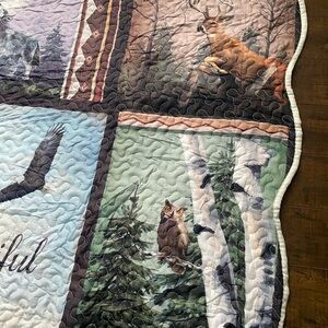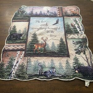 Beautiful quilted blanket with nature scenes. Features deer, wolves, and trees. Perfect for cozy nights.