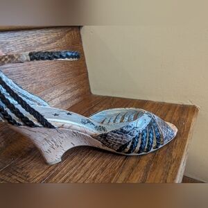 Naughty monkey wedge block 70's inspired ankle strap cork wedge heels. Cork with Snakeskin & braided leather. These are a combination of natural & manmade materials