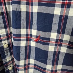This Nautica shirt features a classic blue and white plaid pattern, perfect for casual occasions. Made from a comfortable cotton blend, it offers a relaxed fit with short sleeves and a traditional collar. Ideal for adding a touch of style to your everyday wardrobe. Length 32" Width 24" Sleeves 12"