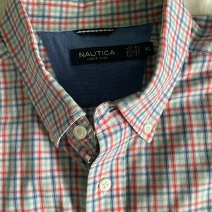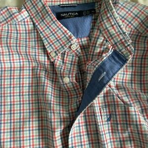 Men’s XL, button down collar, front button down, excellent condition. Blue and red color. 70% Cotton, 30% Lyocell.