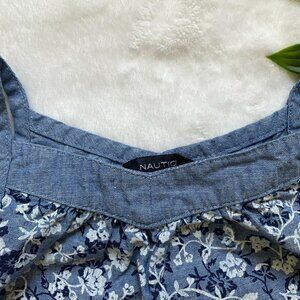 Nautica toddler girl dress, size 24 months. Light blue with a white floral print, featuring a sleeveless A-line design and denim trim along the neckline and straps. Measures 39 cm (15.4 inches) from top of strap to bottom, making it a shorter dress, or long tunic shirt.