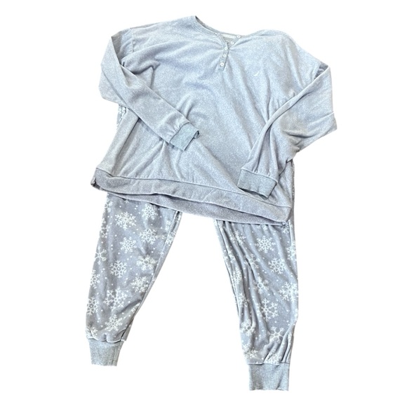 Cozy and stylish purple pajamas set from Nautica. Soft fleece that’s not too heavy. Bottoms have tie at waist and is elasticized. Bottoms have hand pockets. Top and bottoms have matching cuffs.