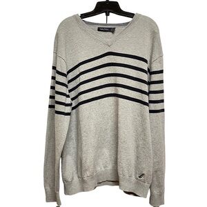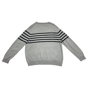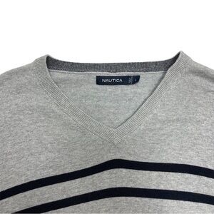 Nautica knitted sweater solid grey with navy blue stripes on the chest. V neck. Ribbed hem, cuffs and neck. Loose fit. Embroidered logo at the bottom left. 100% cotton. Excellent condition, no flaws.