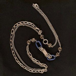 Decorative accents on chain include nautical navy blue ovals, smokey gold crystals, and a box charm with six (6) rhinestones on each side.