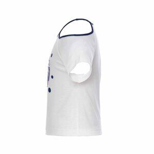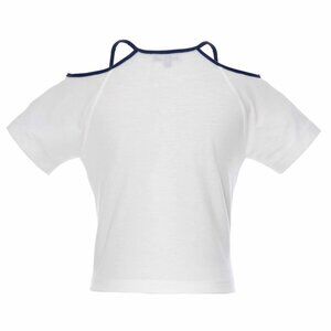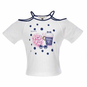 A charming two-piece Nautical Summer Skirt Outfit for Girls, featuring a chic t-shirt and skirt combination. The tee showcases a cold shoulder design accented with navy blue polka dots. The center stage of the t-shirt is a charming graphic design. The sleeves and neckline are accentuated with a navy blue trim that adds a nautical flair to the overall design. The comfortable round neck is further highlighted by a navy stripe, giving it a sporty look.