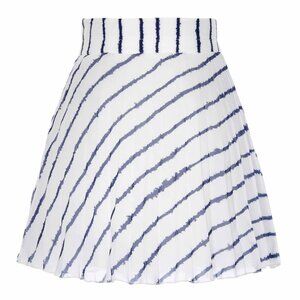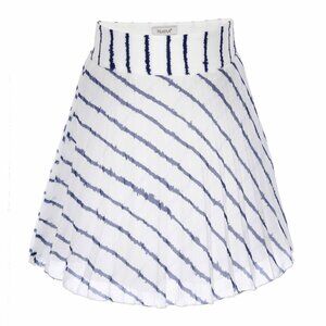 Paired with the t-shirt is a flared skirt that complements the top perfectly. The skirt is white with a striking diagonal navy blue stripe pattern. The stripes give the illusion of waves, making it a great summer ensemble. For practicality and ease, the skirt includes a discreet side zipper, ensuring a smooth and secure fit.