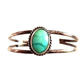 Pretty color turquoise in this 925 (tested, unstamped) vintage cuff. Unsigned. Face is 7/8" high. Smooth bezel in twisted rope setting. 5" end to end with 1.25" gap. Lots of flex for fitting.