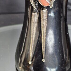 Navajo Turquoise And Coral Sterling Silver Bolo Tie Signed. USA Native American