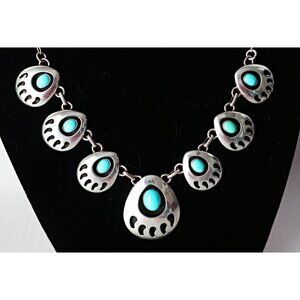 Navajo Vintage Turquoise Bear Paw Sterling Silver Necklace and Earrings Set