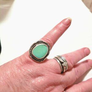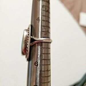 Navajo, unsigned vintage turquoise sterling silver ring. Size 5. Turquoise a light blue/green. Quite unique color. Very nicely made. Band is slightly out of round from wearing.