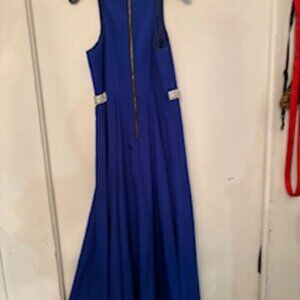 Beautiful cobalt blue maxi dress/gown with rhinestone attached belt. Zipper back.
