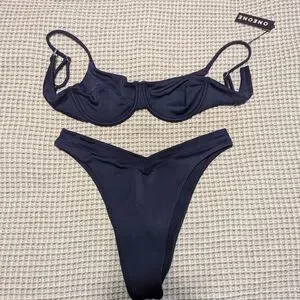 Stylish and comfortable navy bikini set by . Perfect for a day at the beach or poolside lounging. The brand is one one swim from Columbia and retails for 130 usd before taxes and import duties. I've only ever tried it on, never has been worn. top is size large and bottom is xl.