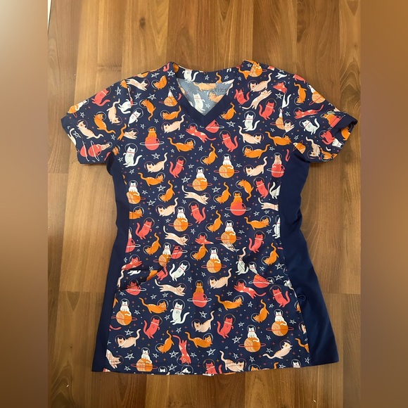 Vibrant navy blue scrub top with playful animal print. Features a comfortable fit and short sleeves. Scruletics like Scrubstar size XS never worn