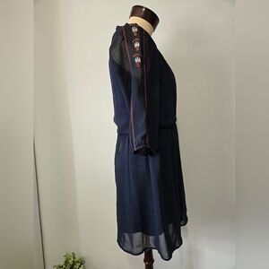 Elegant navy blue dress with Aztec embroidery.  Sheer sleeves. Elasticated waist. The dress is sheer with a slip underneath.