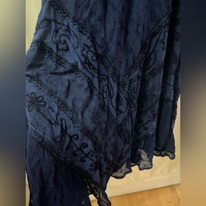 Beautiful bohemian-inspired navy blue dress from My Choice, made from soft and breathable 100% rayon. Features a romantic lace-up front bodice with floral velvet embroidery, adjustable shoulder straps, and a smocked back panel for a comfortable, flexible fit. The flowy asymmetrical hem and sheer embroidered panels add gorgeous texture and movement.