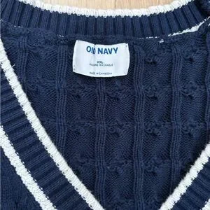 Classic navy blue cardigan with a V-neck. Features white trim and button closure. Ideal for layering.