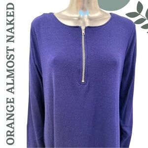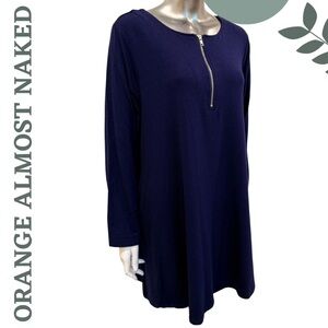 Sleek, simple, and effortlessly cool—this navy tunic by Orange Almost Naked features a modern zip-front neckline and relaxed silhouette. The long sleeves and soft stretch fabric make it perfect for layering or wearing solo. Pair it with leggings or boots for a polished casual look. Details: • Brand: Orange Almost Naked • Color: Deep navy blue • Style: Long sleeve tunic with zip-front neckline • Fit: Relaxed, slightly A-line • Size: Large / Extra Large • Material: 67% Viscose 28% Polyester 5% Spandex • Condition: Excellent pre owned condition • Best For: Casual wear, travel, minimalist style, layering looks Tags: #OrangeAlmostNaked #NavyTunic #RelaxedStyle #CasualChic #EverydayLook