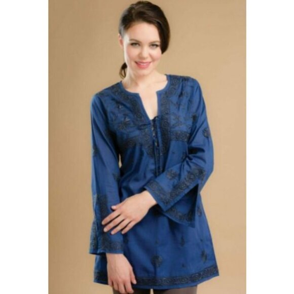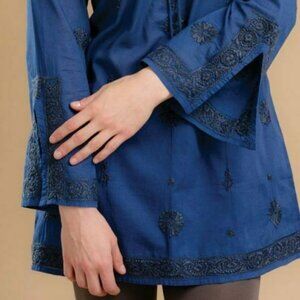 This Embroidered Tunic is hand embroidered by women artisans in Northern India. This soft tunic has beautiful embroidery and a tassel tie closure, and is made with 100% cotton.
