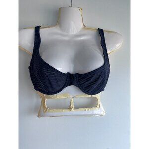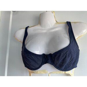 This striped navy blue demibra is a must-have addition to your lingerie collection. The tags have been cut off, so the size is uncertain. Fits a range of 30F-32G, but can't guarantee fit. The back closure allows for easy on and off, while the breathable material ensures you stay cool and comfortable all day long. This bra has a trendy semi-sheer striped pattern in navy blue. The demi cup style adds a touch of elegance, making it perfect for dressing up or down. Whether you're looking for a comfortable bra for everyday wear or something for a special occasion, this demibra is the perfect choice.