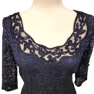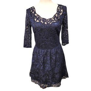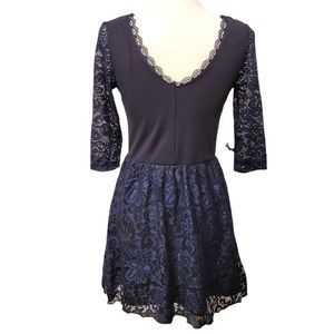 Navy Blue Dress with Elastic Waist 3/4 Sleeves and Lace Overlay