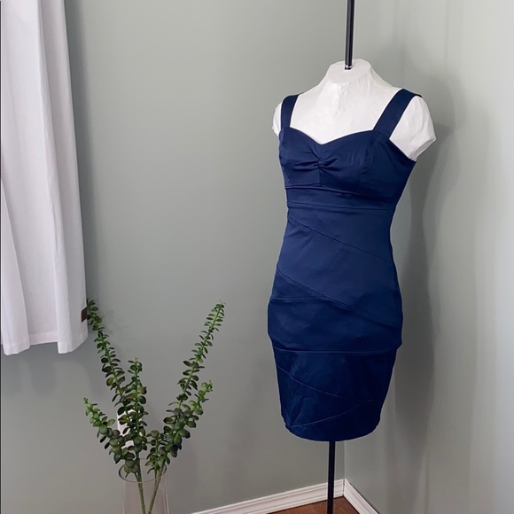 Fitted formal or semi-formal dress with criss-cross panelling detail front. In excellent condition with no flaws.