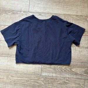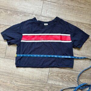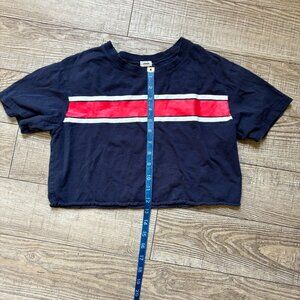 Cute and comfy Navy Blue T-shirt with white and blue stripes on front only.