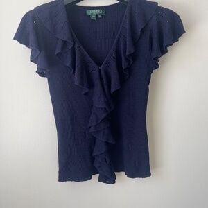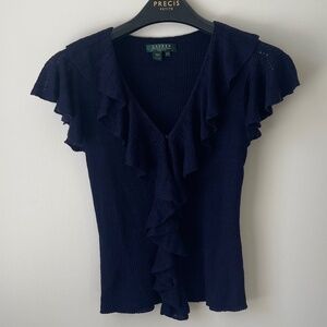 This Ralph Lauren navy blue top has a ruffle down the front, the sleeves and around the collar in a pointelle pattern knit. The body of the garment is a rib knit with stretch.