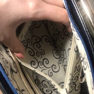 Unable to find brand on this purse but it’s in great shape! Good quality material, I’m thinking the brand is not a cheap one so this will be a good investment. Two open pockets two zipped within the purse. Zipped hidden pocket in the back of the bag. This bag does have some wear on it as it was handed down but nothing you can see from afar!