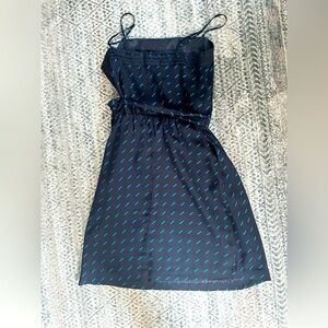 midi dress features a flattering tie waist and adjustable spaghetti straps for the perfect fit. Designed with a stylish contrast of navy blue and light blue accents, it’s perfect for both casual and dressy occasions. The back zipper ensures easy wear, and the silhouette is incredibly flattering.