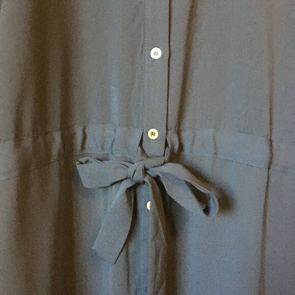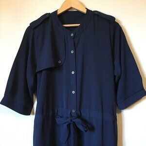 Very good preowned condition, dark navy blue, button down tunic dress with drawstring waist for adjustment. Not sure what this brand is, but it's a pretty decently made dress with a storm guard/flap on one shoulder, tie up at the waist, banded collar and shoulder tabs. Has some strong military vibes.