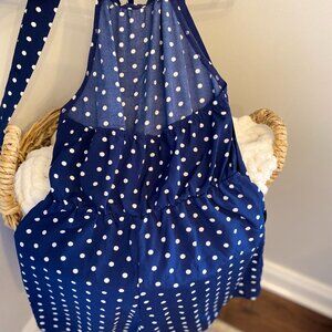 Chic and playful navy blue halter romper with white polka dots. Features a tie-back halter neckline, elastic waist, and flouncy shorts for a flattering silhouette. Lightweight and unlined—perfect for warm weather or layering with a denim jacket. Great for summer outings, vacations, or casual days. Gently worn and in excellent condition with no visible flaws.