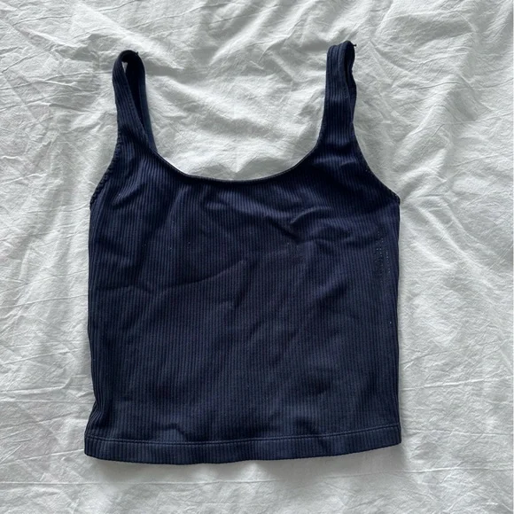 This stylish navy blue ribbed top is perfect for any occasion. Its sleek design offers both comfort and elegance.