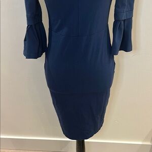 This navy blue sheath dress features a mock neck and stylish bell sleeves that extend to three-quarter length. The fitted silhouette hugs the body's contours, making it a perfect choice for cocktail events or work occasions. A subtle keyhole cutout adds a touch of elegance to the neckline.