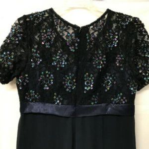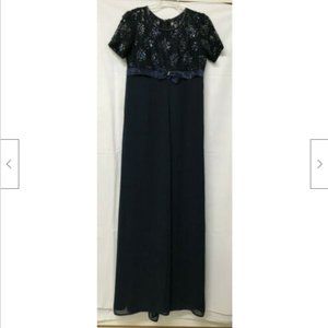 Navy blue long evening dress has sequin & lace bodice, short sleeves, ribbon bow at waist, satin skirt with sheer chiffon overlay. Overlay is open in the middle front of skirt. Zipper closure at center back. No tags, fits like a women's size "small". See below for measurements. Very good pre-owned condition. The pictures show the actual dress that you will receive.