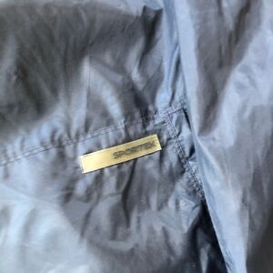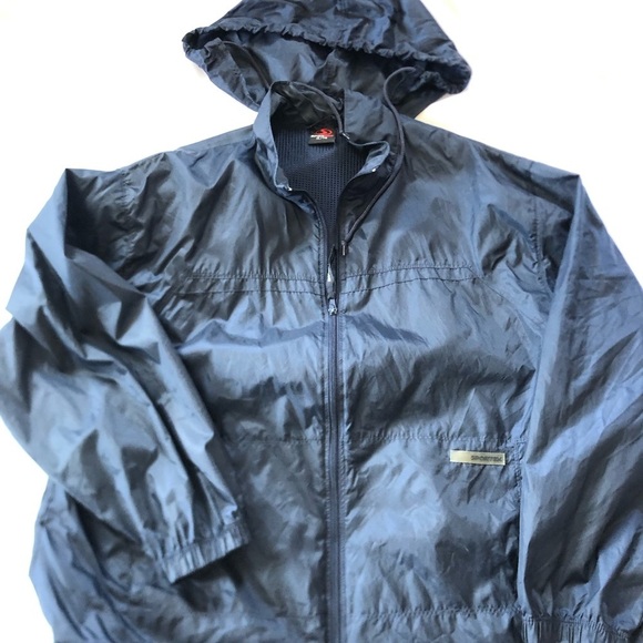 This navy blue windbreaker is crafted from lightweight synthetic material, offering a sleek and sporty look. Designed for outdoor activities, it features a full-length zipper and a roll up hood for added style and comfort.