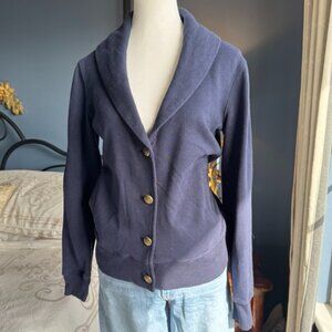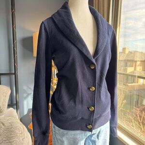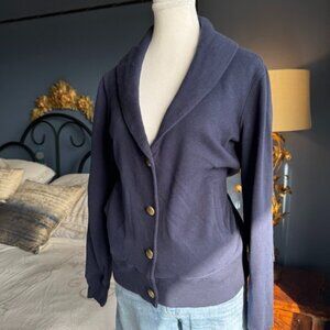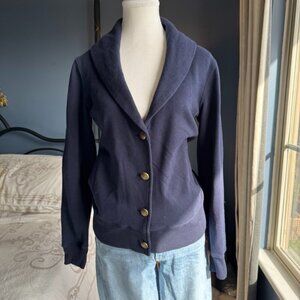 Navy Blue Tommy Hilfiger sweatshirt cardigan, button down, size S. Normal wear, very cozy, antique bronze colour buttons. Bust measures 19 inches laying flat, length from shoulder to hem is 22.5 inches. 60% cotton 40% polyester. Cat friendly, nonsmoking home.