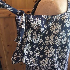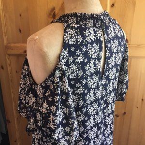 Navy Blue and White Flowered Dress with Flutter Sleeves Size M