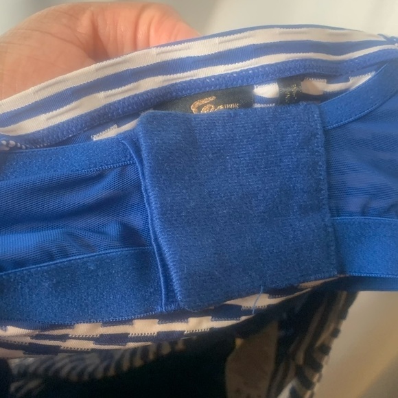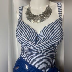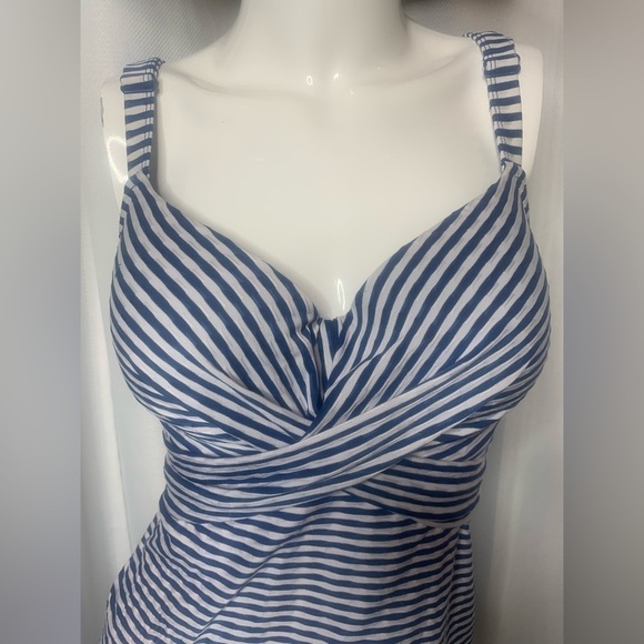 This figure flattering preloved Spa Swimwear blue and white striped crossover tankini top is so stylish and celebratory of summer. Has adjustable built in bra and straps.