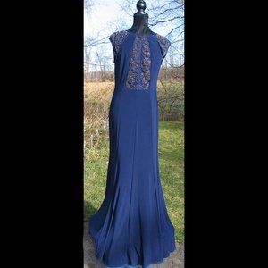 Illusion studded inserts on shoulders and back. A very slimming and elegant navy blue. Zipper in back. This dress is a jersey knit, drapes beautifully, fully lined, but is suitable for someone on the taller side, definitely not petit. Measurement on the hanger, 34" 32" 36" but expands easily to hug ones curves. The studding is more like a type of bead in an antique coloured dark copper. In like new condition