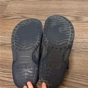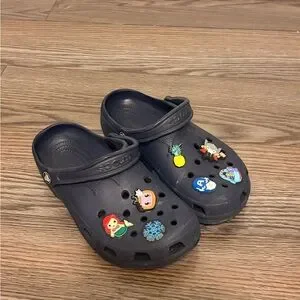 These navy clogs for kids feature playful charms for a fun look. Perfect for everyday wear, they offer comfort and style. Some wear on the bottom of the shoes (as pictured). Women’s 5