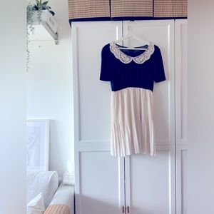 Navy & Cream Pleated Dress with Peter Pan Pearl Lace Collar – Size S-M